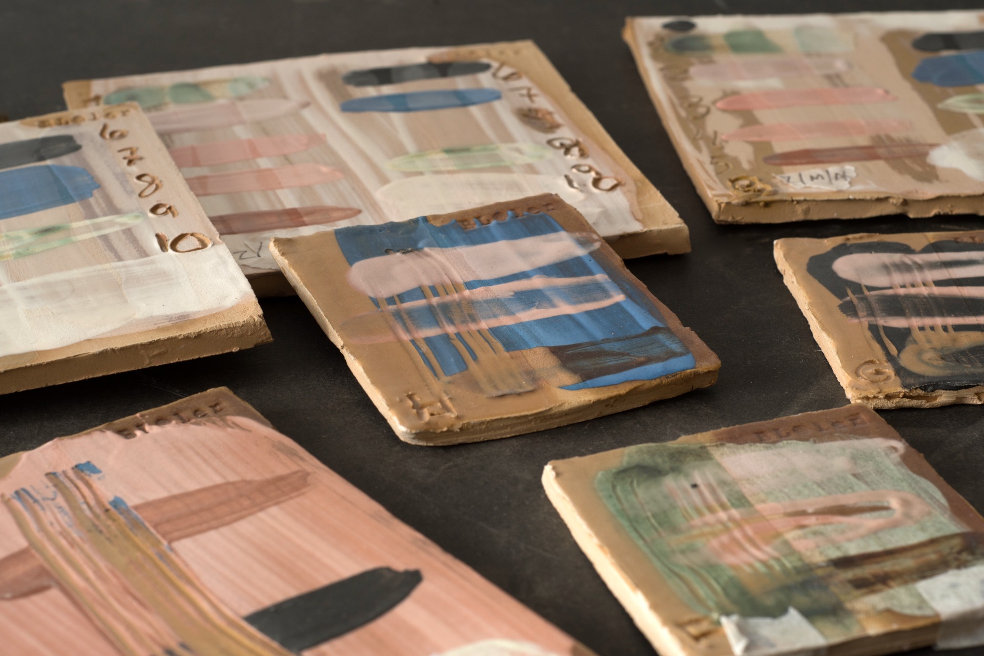 I mine undersøgelser laver jeg mange rækker af prøver. Lige fra indfarvning af nye begitninger, der understøtter min formgivning, til forskellige strukturer i lerets overflade.
